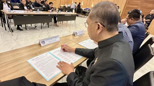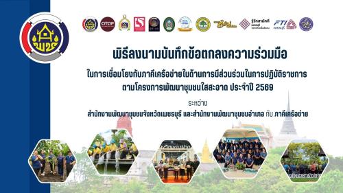 วันที่ 21 มกราคม 2569 เวลา 09.30 น. ณ ห้องประชุมสหกรณ์การเกษตรบ้านลาด ตำบลบ้านลาด อำเภอบ้านลาด จังหวัดเพชรบุรี นายธรรมนูญ ไขว้พันธุ์ พัฒนาการจังหวัดเพชรบุรี เป็นประธานในพิธีลงนามความร่วมมือในการเชื่อมโยงกับภาคีเครือข่ายในด้านการมีส่วนร่วมในการปฏิบัติราชการตามโครงการพัฒนาชุมชนใสสะอาด ประจำปี พ.ศ. 2569 ระหว่างพัฒนาการจังหวัดเพชรบุรี กับ ภาคีเครือข่ายการพัฒนา ที่มีบทบาทสำคัญในการส่งเสริมสนับสนุนการขับเคลื่อนงานพัฒนาชุมชนในจังหวัดเพชรบุรี